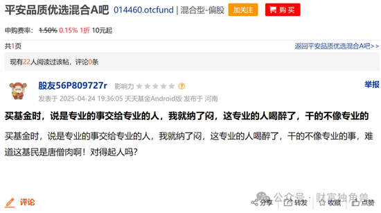 基金业绩亏损,有基民发帖称,买基金时,说是专业的事交给专业的人,我就纳了闷,这专业的人喝醉了,干的不像专业的事,难道这基民是唐僧肉啊!对得起人吗?也有基民表示,可不可以换个经理,三年亏近30%,还在管理新发基金,那么多支基金,有那么多精力么。