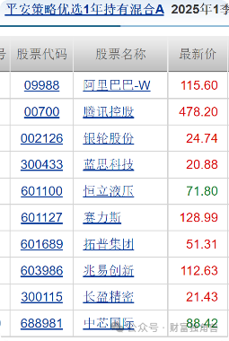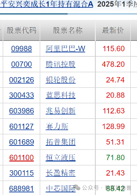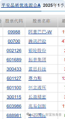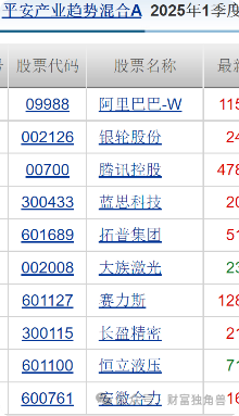 笔者发现,神爱前经理旗下基金持股重合较多,我们以2025年1季度前十大重仓股持股为例,平安策略优选1年持有混合A、平安产业趋势混合A、平安兴奕成长1年持有混合A、平安品质优选混合A,这4只基金有8只股票持有趋于一致,这包括阿里巴巴-W、腾讯控股、银轮股份、拓普集团、蓝思科技、赛力斯、恒立液压、长盈精密。